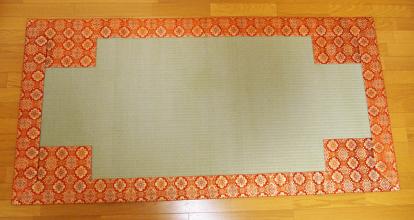 縁を別誂正絹四丁の朱地の生地で誂えた拝敷です。
